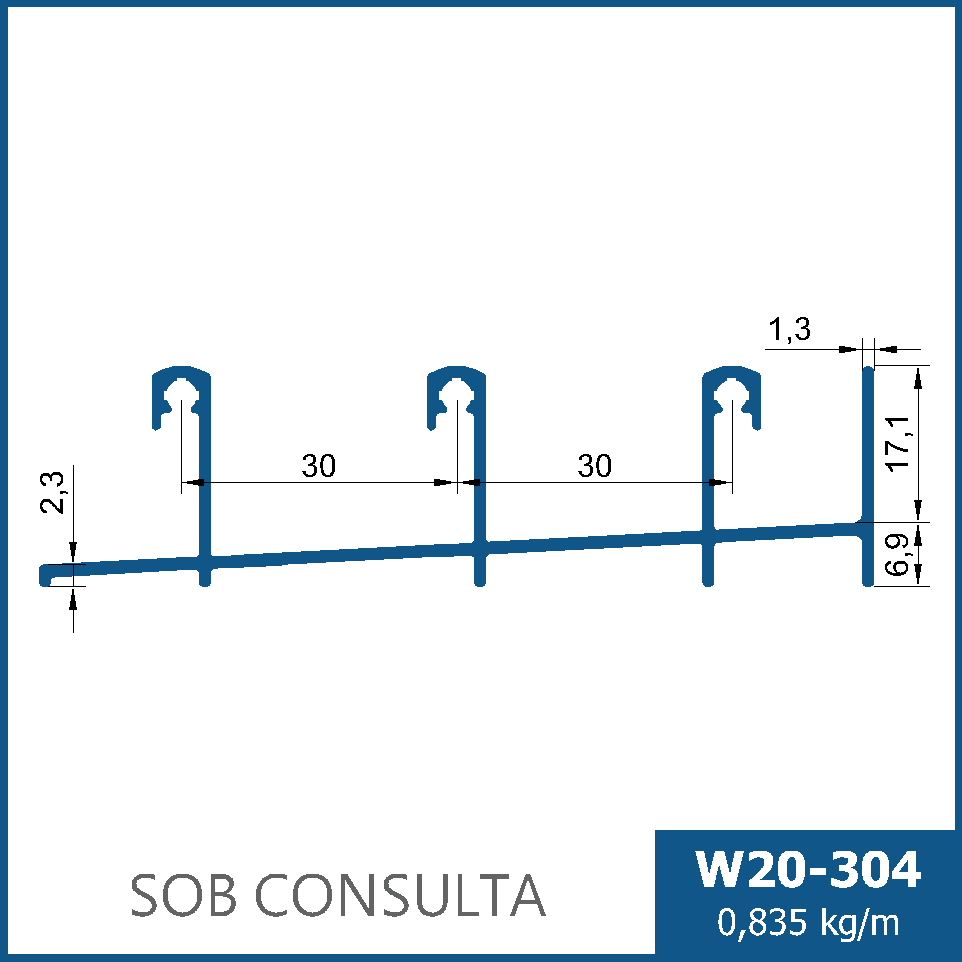 Trilho três planos para portas de correr de pequeno a médio porte.