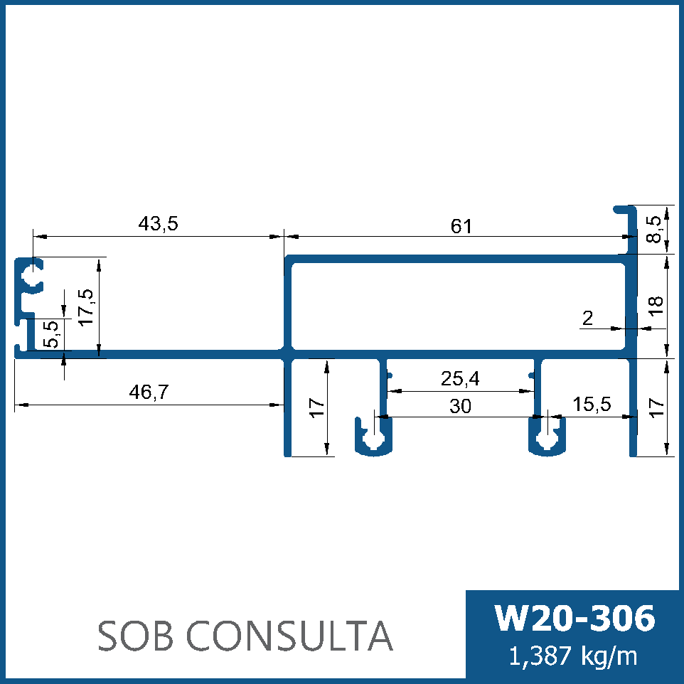 Marco largura intermediária de dois planos, indicado para portas e janelas de correr da linha W20 com persianas integrada, de pequeno a médio porte.